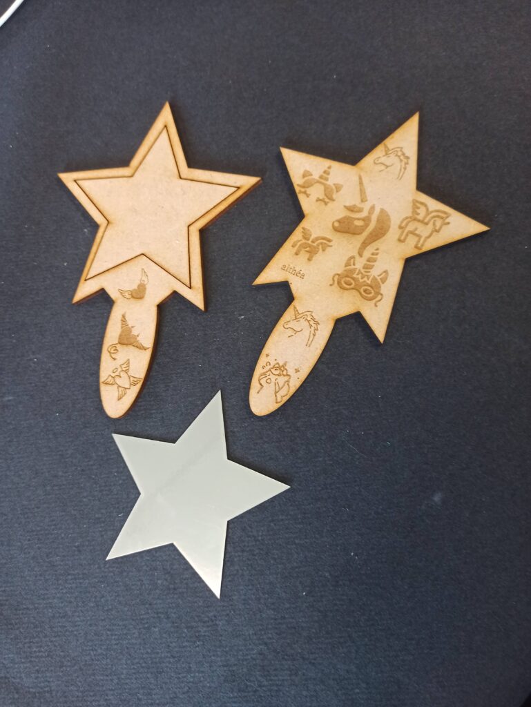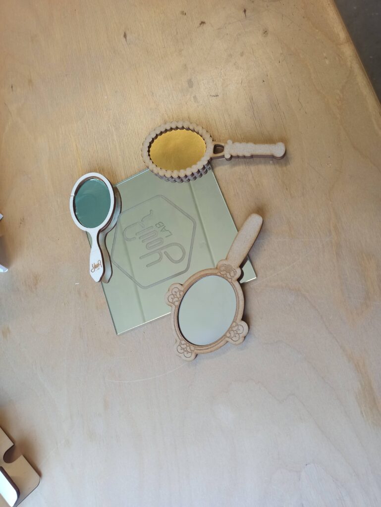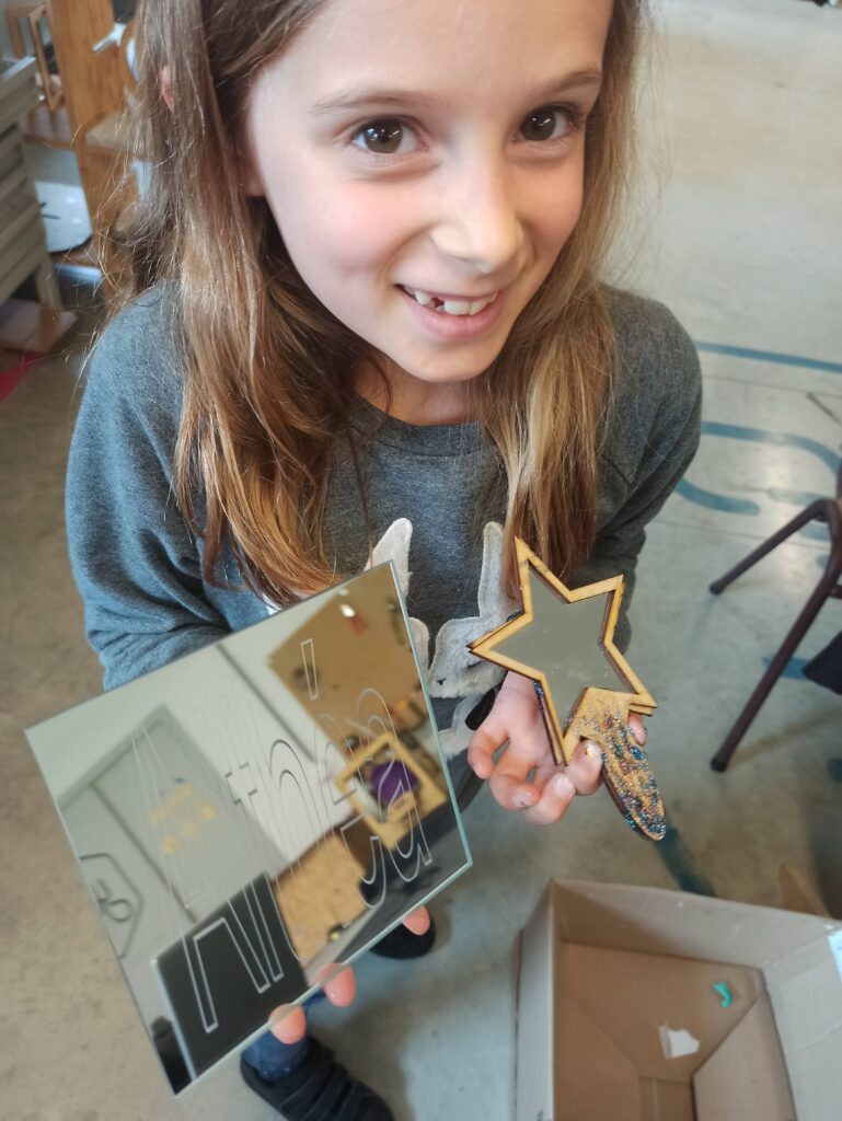 - 2024 – Miroir : en plus de la découpe et gravure sur bois, les enfants ont expérimenté la gravure sur miroir en verre